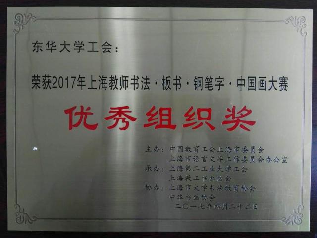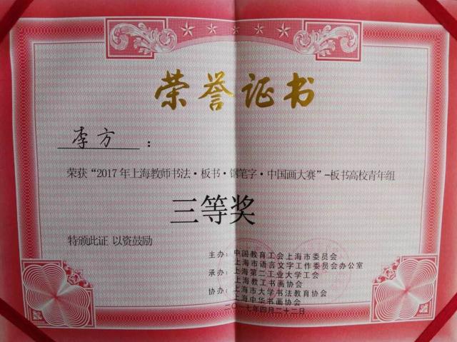 4月22日,2017年上海教师书法·板书·钢笔字·中国画大赛在上海第二工业大学举行。我校党委宣传部朱佳樑、环境学院李方等5位教师参加比赛。朱佳樑老师获书法高校青年组一等奖,李方老师获板书高校青年组三等奖,校工会获“优秀组织奖”,这也是我校自2015年参加该赛事以来取得的最好成绩。