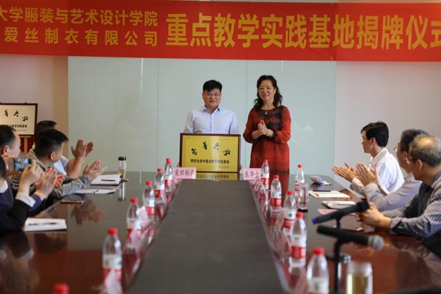 5月3日,我校研究生校外重点教学实践基地揭牌仪式在山东省济宁市汶上县爱丝制衣有限公司举行。久久久久国产成人精品亚洲综合服装与艺术设计学院党委书记袁孟红,汶上县县委常委、副县长刘刚,副县长杜劲松出席揭牌仪式,县委组织部副部长徐青主持揭牌仪式。袁孟红与刘刚共同为基地揭牌。