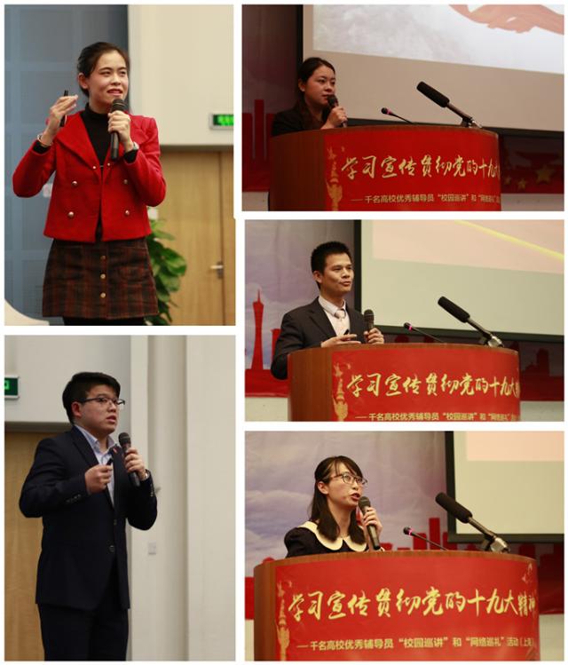 在“双巡”活动现场,第七巡讲组成员,华东政法大学缪岚、上海海事大学李吉彬、华东理工大学崔美娜、上海交通大学蔡毓彬、上海电力学院吕莹等5名优秀辅导员分别以《放飞青春梦想,书写人生华章》、《建设海洋强国,推进中华民族伟大复兴》、《做社会主义核心价值观的积极践行者》、《坚定文化自信,讲好中国故事》、《不忘初心,熔铸时代新青年》为题依次巡讲,用身边人、身边事展现五年来党和国家事业取得的历史性成就、发生的历史性变革;畅谈对十九大报告的学习感受、对习近平新时代中国特色社会主义思想的理解领悟;聚焦青年成长成才,号召广大青年要有理想、有责任、有担当,要坚定理想信念、志存高远、脚踏实地、勇作新时代的弄潮儿,在实现中国梦的生动实践中放飞青春梦想,在为人民利益的不懈奋斗中书写人生华章。巡讲赢来了阵阵掌声,充分展现了上海市优秀辅导员的风采。