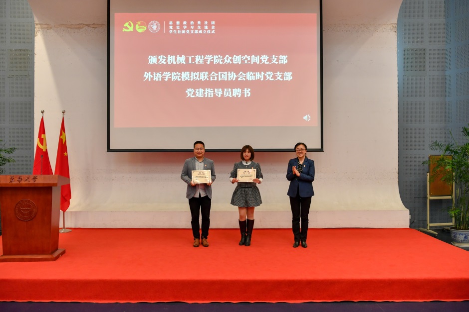 崔运花和机械学院党委书记王新厚、外语学院党委书记李佳耀以及社团党支部党员代表共同为机械学院众创空间党支部、外语学院模拟联合国协会临时党支部揭牌。党委组织部部长林嵘为第一批学生社团党支部党建指导员颁发聘书。