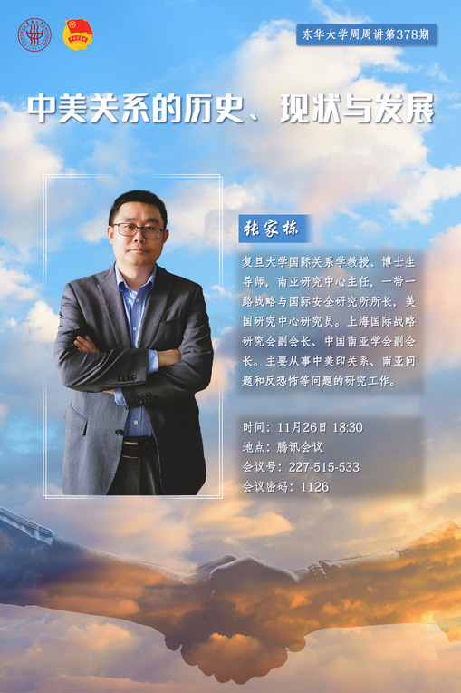 主讲人简介:张家栋,复旦大学国际关系学教授、博士生导师,南亚研究中心主任,一带一路及全球治理研究院战略与国际安全研究所所长,美国研究中心研究员。主要从事中美印关系、南亚问题和反恐怖等问题的研究工作。在中央电视台、凤凰卫视、东方卫视、解放日报等媒体发表数百篇时事评论。